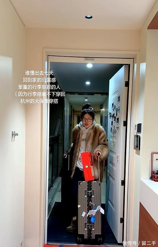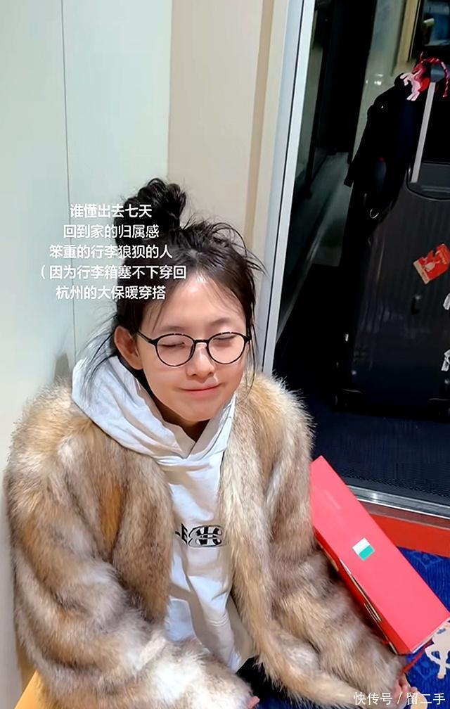 像这回,章芊意回杭州时,拉了仨大箱子,自己还披着一件厚皮草,说是行李实在塞不下,干脆直接穿身上。