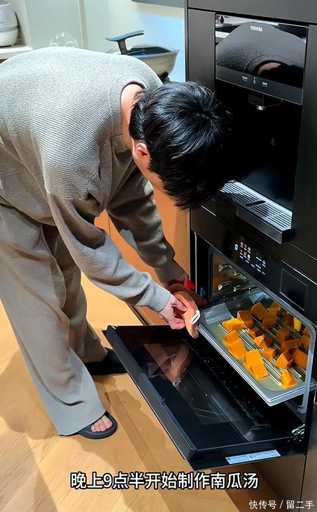 老公也没嫌弃,反而亲自剁南瓜、下馄饨,一碗馄饨全是给媳妇准备的,自己全程只负责端菜收拾。