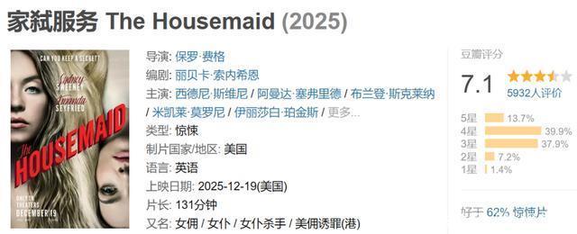 一部美剧《亢奋》,让身材火辣、金发碧眼的女星“悉尼妹”彻底火了。 最近,她带来了一部大尺度的惊悚新片。 《家弑服务》2025 豆瓣评分:7.1 推荐理由:尺度惊悚爆款 时长:131min 推荐指数:★★★★ 本片由保罗·费格指导,改编自同名畅销小说。 西德尼·斯维尼与阿曼达·塞弗里德两位美人主演,上演一场充满刺激和反转的大戏。 本片上映后,票房口碑都不错,在一众惊悚片中获得了豆瓣7.1的评价。 01 故事,从女主米莉说起。 高中时期,米莉因谋杀罪被判了15年,如今已经服刑十年,获得了保释的机会。 前提是,她必须找到一份稳定的工作,否则还是会被送回监狱。 这天,她带着一份伪造的简历来到了一座庄园内,面试这家的女佣。 女主人温彻斯特人美心善,二人聊得很开心。临走时她还给米莉塞了20元的路费。 靠着这20元米莉又活了几天,差点就到了斩杀线,不过幸运的是米莉被录用了。 米莉被安排住在庄园的阁楼中,环境非常好,温彻底特还给她开了10万的年薪。 进来之后,米莉见到了这家的男主人安德鲁,还有一个小女儿西西。 米莉决心想做好这份工作,却没想到在上班第二天就看到了诡异的一幕: 温彻斯特一大早就在厨房发疯,像是完全变了一个人,安德鲁只能温柔的安抚。 此后,米莉发现温彻斯情绪多变,特别神经质,相比之下安德鲁十分温柔。 男主人和女仆,总是容易擦枪走火。 就在温彻斯特和西西出门的某天,安德鲁带着米莉去看歌剧,有些意乱情迷。 本来二人睡在两个房间,但温彻底特却给米莉反常的打电话,还威胁要解雇她。 米莉害怕丢掉工作,去找安德鲁求助,二人天雷勾地火,彻底跨越了那条界限。 回来后,女主人温彻斯特似乎看出二人不对,故意诬陷米莉偷了家里的车。 安德鲁忍无可忍宣誓主权,他表示自己再也受不了温彻斯特,让她滚出去。 米莉成了新的女主人,和安德鲁在庄园中度过了天地不知为何物的生活。 说到这,似乎是个鸠占鹊巢的故事。 但别急,反转很快来了。 被赶出去的温彻斯特在车上痛哭,但仔细听,会发现她其实是在放声大笑。 因为,她终于摆脱那个男人了...... 02 显然这一切都是女主人温彻斯特设计的。 那为什么呢? 原来,当初温彻斯特意外怀孕生下孩子,在最脆弱的时候遇到了丈夫安德鲁。 二人的感情很甜蜜,很快就步入了婚姻。 她很快发现,这个男人是个变态。 因为她的头发没有染好,安德鲁就把她关在阁楼,要求她拔下100根带毛囊的头发。 安德鲁还故意设计,让外界认为温彻斯特要淹死自己的女儿,把她送进精神病院。 在外界看来,温彻斯特是疯子。 事实上,安德鲁才是一个十足的施虐狂。 温彻斯特想要逃离,奈何女儿成了“人质”。 于是她忍气吞声,一直在物色能让她逃离的人选,直到米莉的出现。 这个刚刚出狱金发碧眼的年轻女孩,能完全满足安德鲁的被崇拜欲和控制欲。 温彻斯特导了一场大戏,成功带女儿脱身。 另一边,以为自己身处于天堂的米莉,也很快发现了安德鲁的不对劲。 只因为她打碎了家里的瓷器,安德鲁就把她迷晕,随后锁进了阁楼。 安德鲁塞进去一片碎片,要求米莉在自己的肚子上划21道伤痕,表示她接受惩罚。 但米莉也是个狠人。 她高中时期的“谋杀罪”,其实是因为看到室友被侵犯,才狠手杀掉了人渣。 这一次,她也决心再次做“清道夫”。 米莉假装屈服,却在安德鲁进来检查的时候把小刀插入了他的脖子,随后趁其不备,把他锁进了阁楼。 没过一会儿,她塞进去了一把钳子。 这次,他要让人渣也尝尝被控制的滋味...... 以上,是本片的部分剧情。 作为一部惊悚片配资股网址,本片的氛围渲染还是很不错的,几次反转也非常带感。 开始:保姆偷情男主人,中间:找替身的恐怖戏码,结局:女孩互助。 主演们的演技还是相当在线的,锤爆渣男的戏码,可以说是十足的爽片。 当然缺点也很明显,片中的要素很多,剧情实在太狗血了。 总的来说,对于冲着悉尼妹来的观众,当成一部爆米花电影,还是可以一看的。
