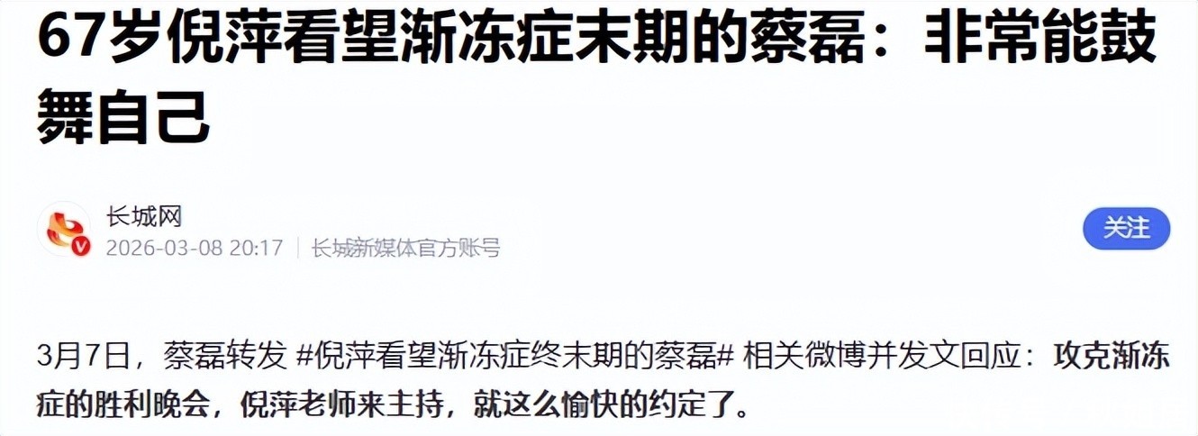 整场会面,言语朴素无华。倪萍坦言,自己有时清晨睁眼,望着镜中斑白的鬓角,也会生出几分怅然;可每当看到蔡磊的状态——哪怕全身肌肉已渐次失控,仍坚持伏案整理科研资料、连线病友家属、推进药物临床试验——她便瞬间被注入新的勇气与热望,仿佛生命又重新被点燃。