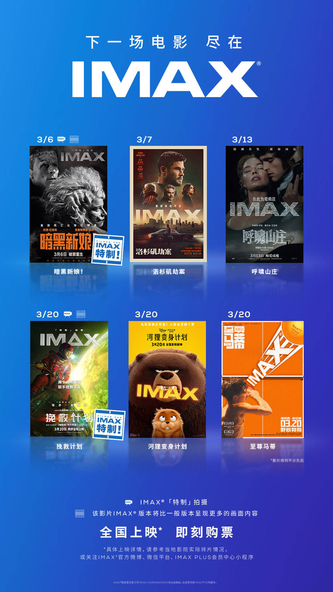 纵观三月IMAX片单,从IMAX特制拍摄带来的画幅盛宴,到类型大片营造的感官氛围,每一部作品都在IMAX的呈现下获得独特的表达空间。六部影片,六种沉浸,从月初到月底的每一周都有值得期待的光影时刻。当灯光渐暗、银幕亮起,一段段截然不同的人生与故事,将在IMAX的方寸之间为你全然开启。