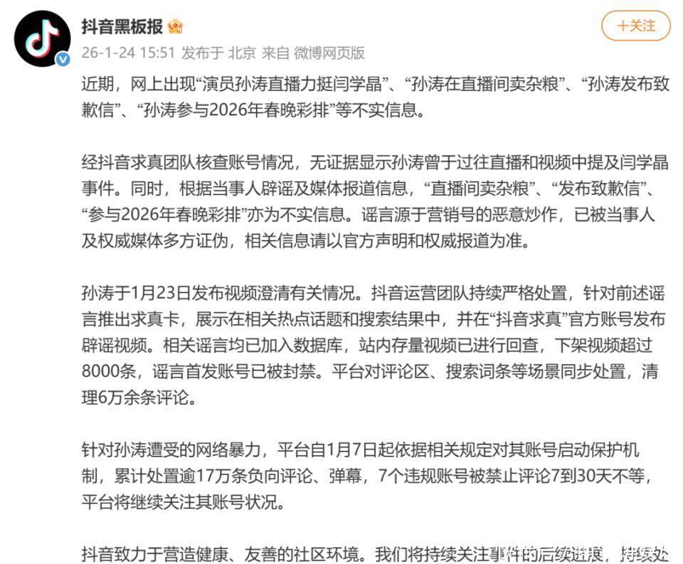 辟谣反击:拿直播录屏硬刚,平台下场封杀8000条谣言孙涛的辟谣堪称“教科书级反击”。他直接放出1月2日全程直播录屏,一帧帧对比谣言截图,证明自己只聊了家常和春晚安排,对闫学晶事件“只字未提”。但荒诞的是,即便证据确凿,仍有网友质问:“你怎么证明这段澄清视频没剪辑?”这种“自证死循环”让他深感无力。