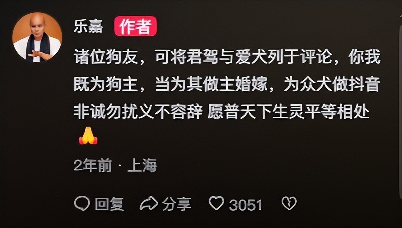 此前他还发布短视频,郑重为小刀发起“全网征婚”,笑称:“众生平等,万物皆可联姻;抖音版《非诚勿扰》,专为天下忠犬设席。”