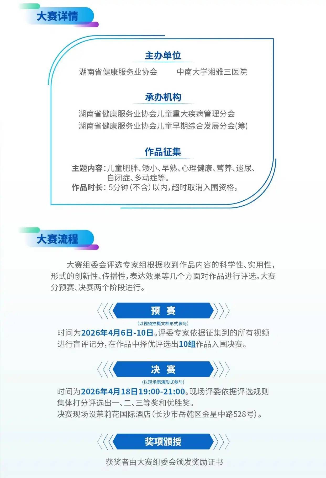 据了解,本届大赛由湖南省健康服务业协会和中南大学湘雅三医院联合主办,聚焦家长最关心的孩子成长问题——肥胖、长不高、发育早、心理情绪、吃饭难、尿床、自闭、多动等。